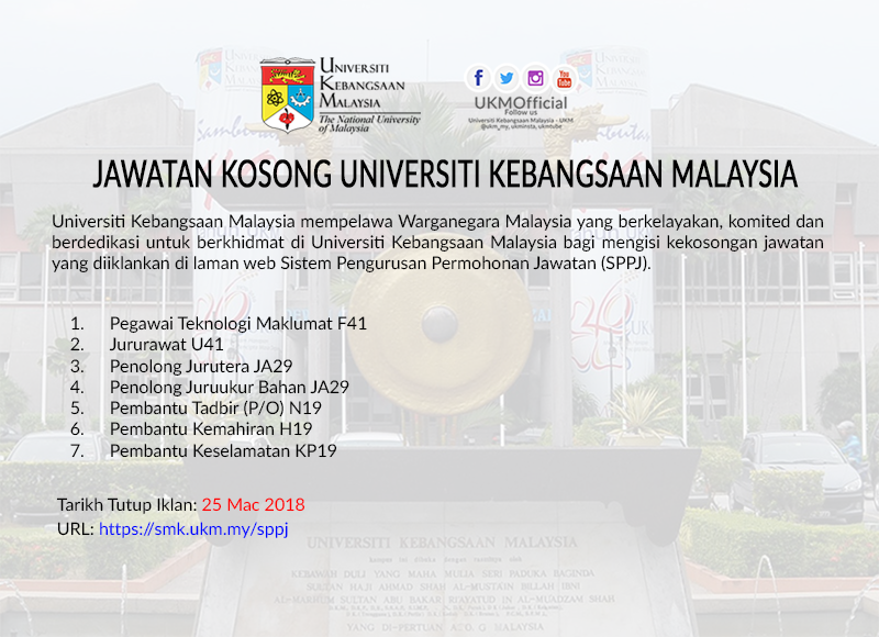 Ukm Malaysia On Twitter Iklan Kekosongan Jawatan Lantikan Kenaikan Pangkat Di Ukm Kampus Kl Bagi Yang Berminat Sila Isi Di Sistem Pengurusan Permohonan Jawatan Sppj Iaitu Https T Co I2lfjauaqy Sebelum 26 Disember 2018