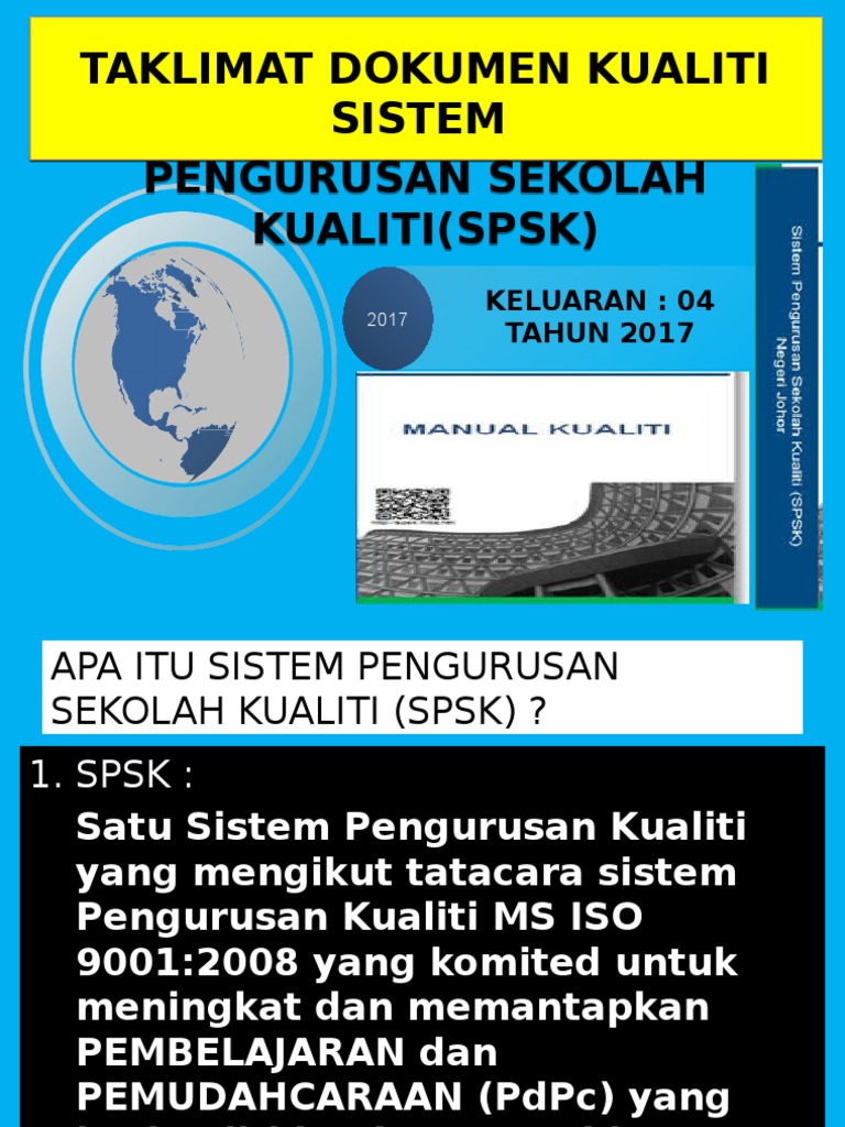 Jabatan pendidikan johor sistem pengurusan sekolah kualiti spsk ke arah ms iso 9001 2008 pengurusan pembelajaran pemudahcaraan sektor jaminan kualiti pejabat pendidikan daerah sekolah rendah menengah negeri johor 2. Say what you do do what you say pemantapan pengurusan dan pelaksanaan pembelajaran dan pengajaran 16 march 2017 pengisian skpmg2 tahun 2017. Instrumen pemantauan sistem pengurusan kualiti sekolah 2013.