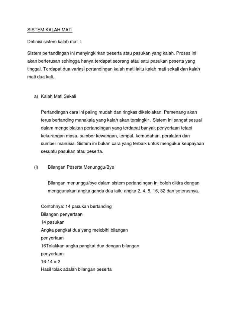 Sistem Pertandingan Kalah Mati Sekali Bye Pdf Document