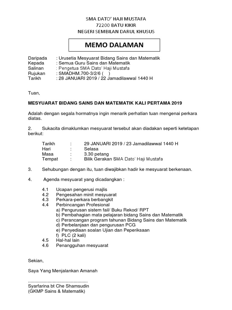 Memo Dalaman Sma Dato Haji Mustafa 72200 Batu Kikir Negeri Sembilan Darul Khusus