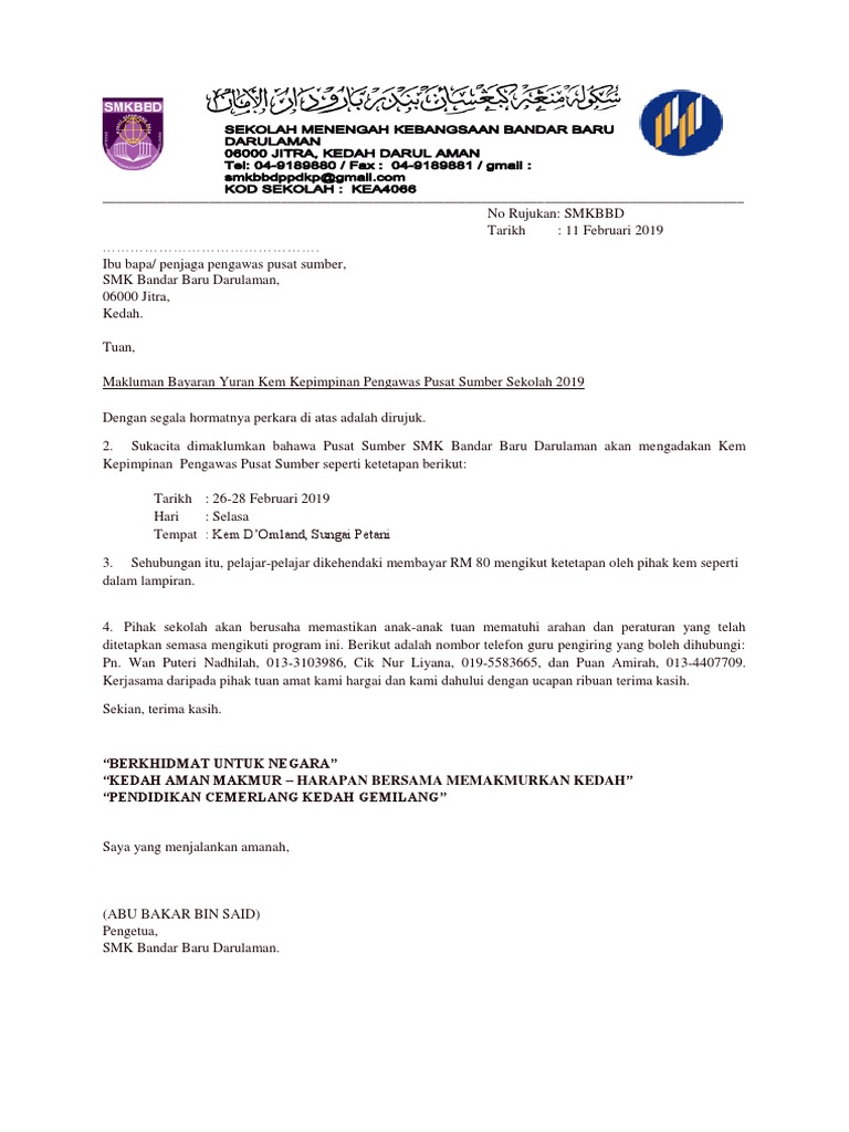 Surat Makluman Bayaran Yuran Kem Pss 2019 Docx