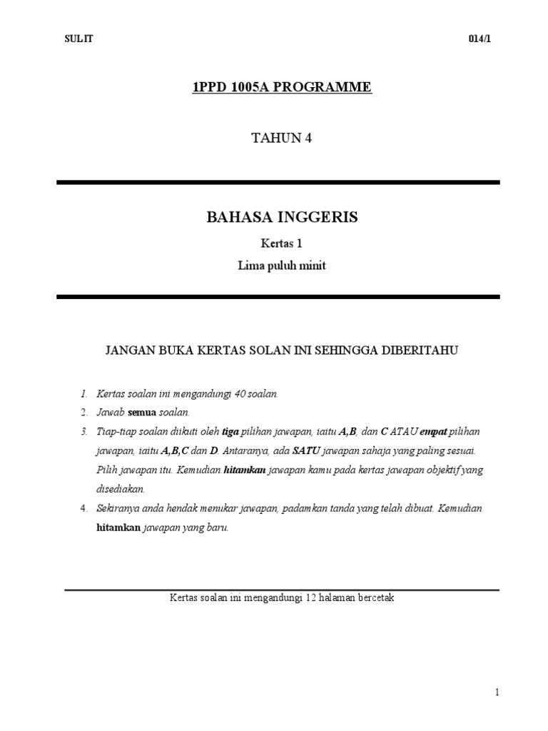 Kertas Ujian Bahasa Inggeris Tahun 4 Kssr Kertas 1